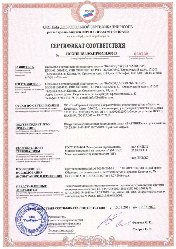 Базальтовый шнур относиться к группе НГ (негорючие) по СНиП 21-01-97 НПБ 244-97